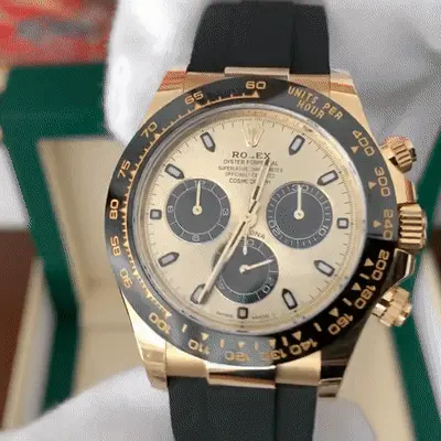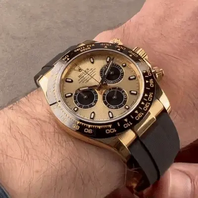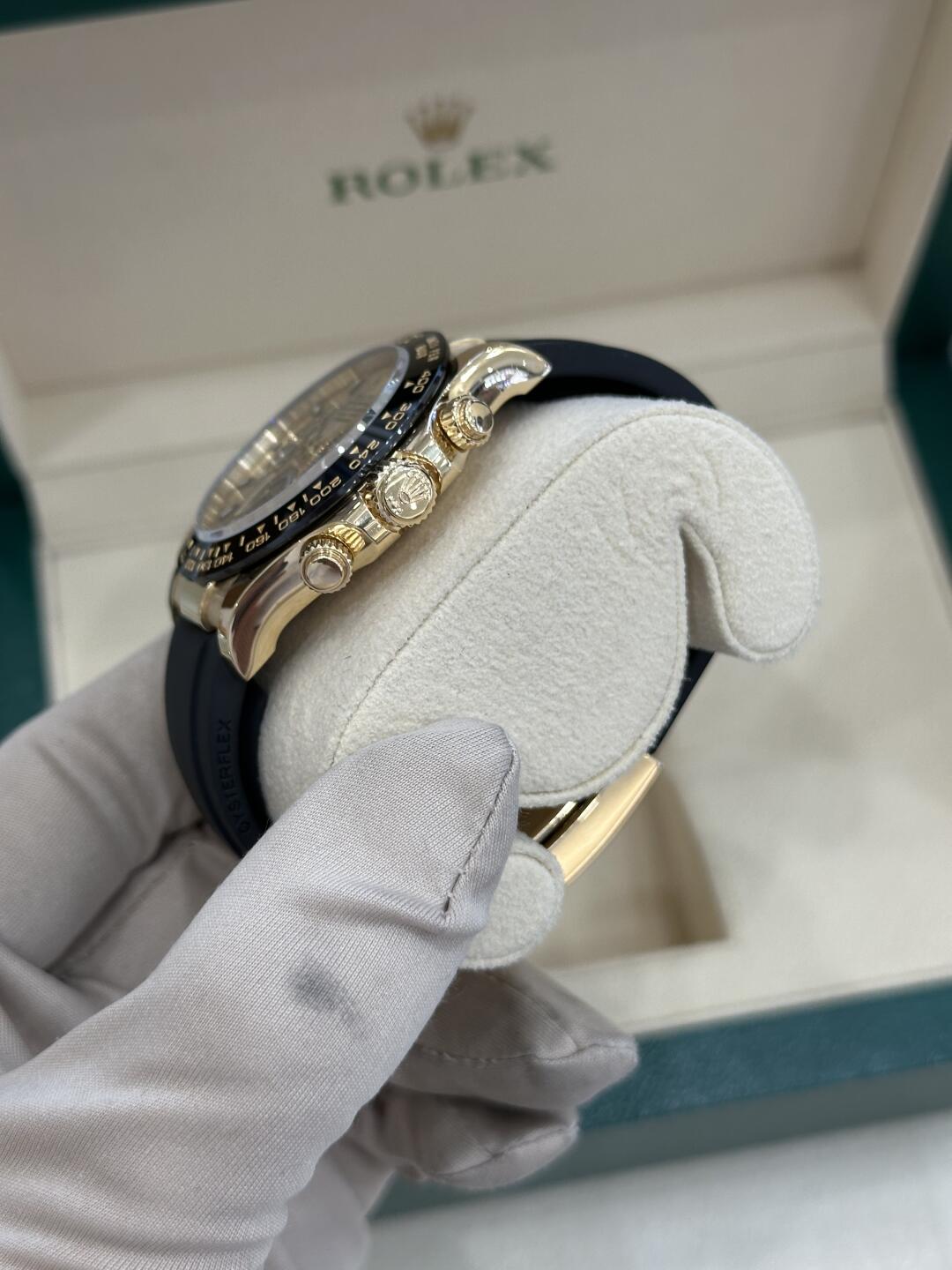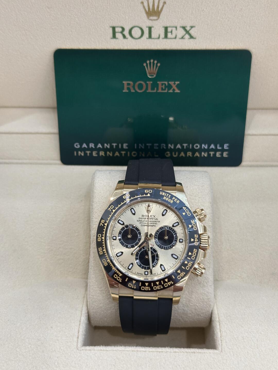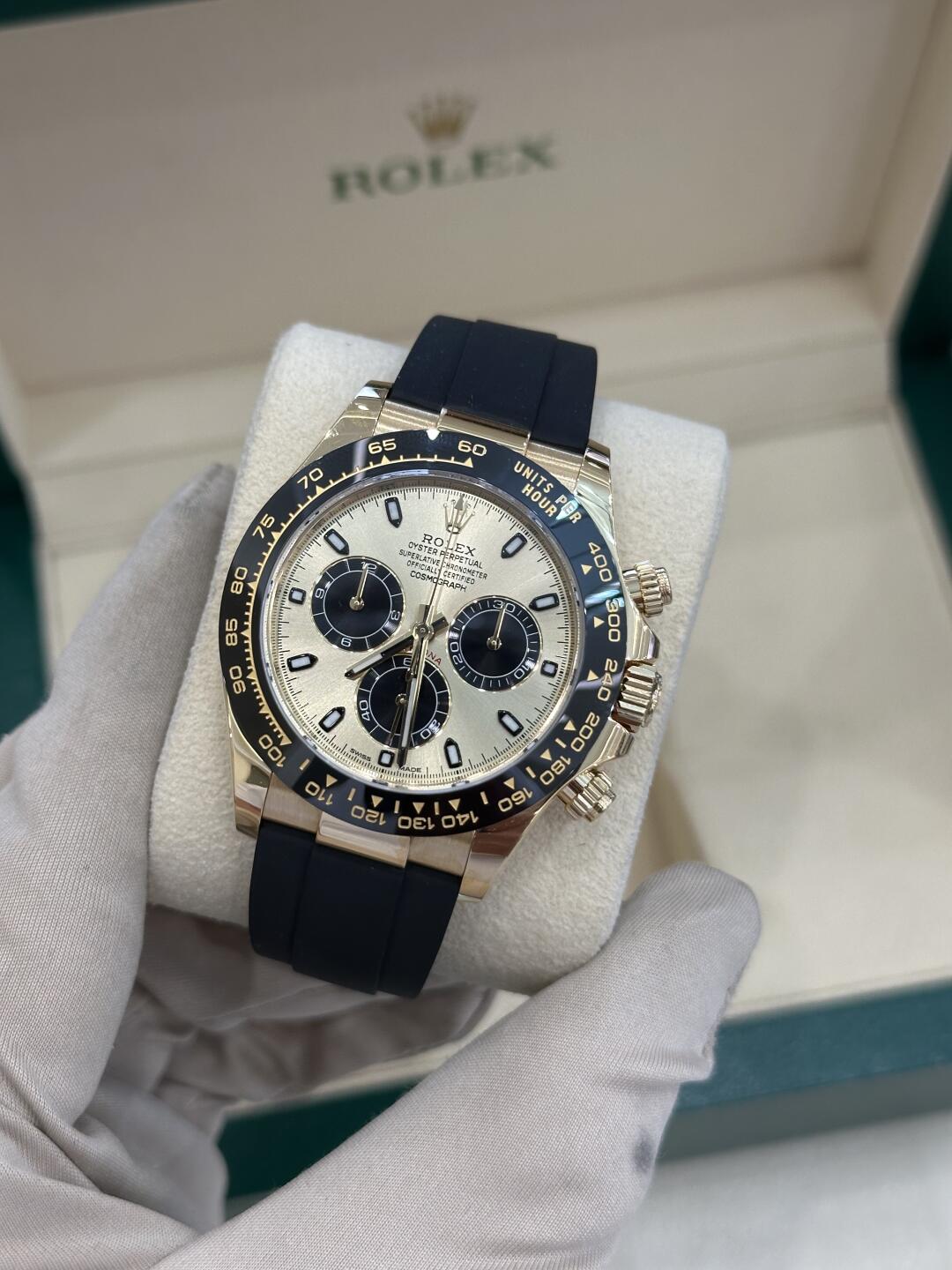 Rolex Daytona Cosmograph (116518LN) self - winding automatic watch, features a 40mm 18k yellow gold case with a black Cerachrom bezel surrounding a champagne dial on a black Oysterflex strap with a yellow gold deployant buckle.