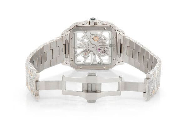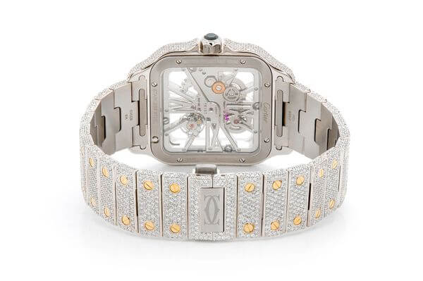 Cartier Skeleton watch iced out is made of Two-Tone and has a 40mm case size with 19.07ctw of diamonds. watch inside and out to Cartier quality standards.. This watch comes with an Cartier box.