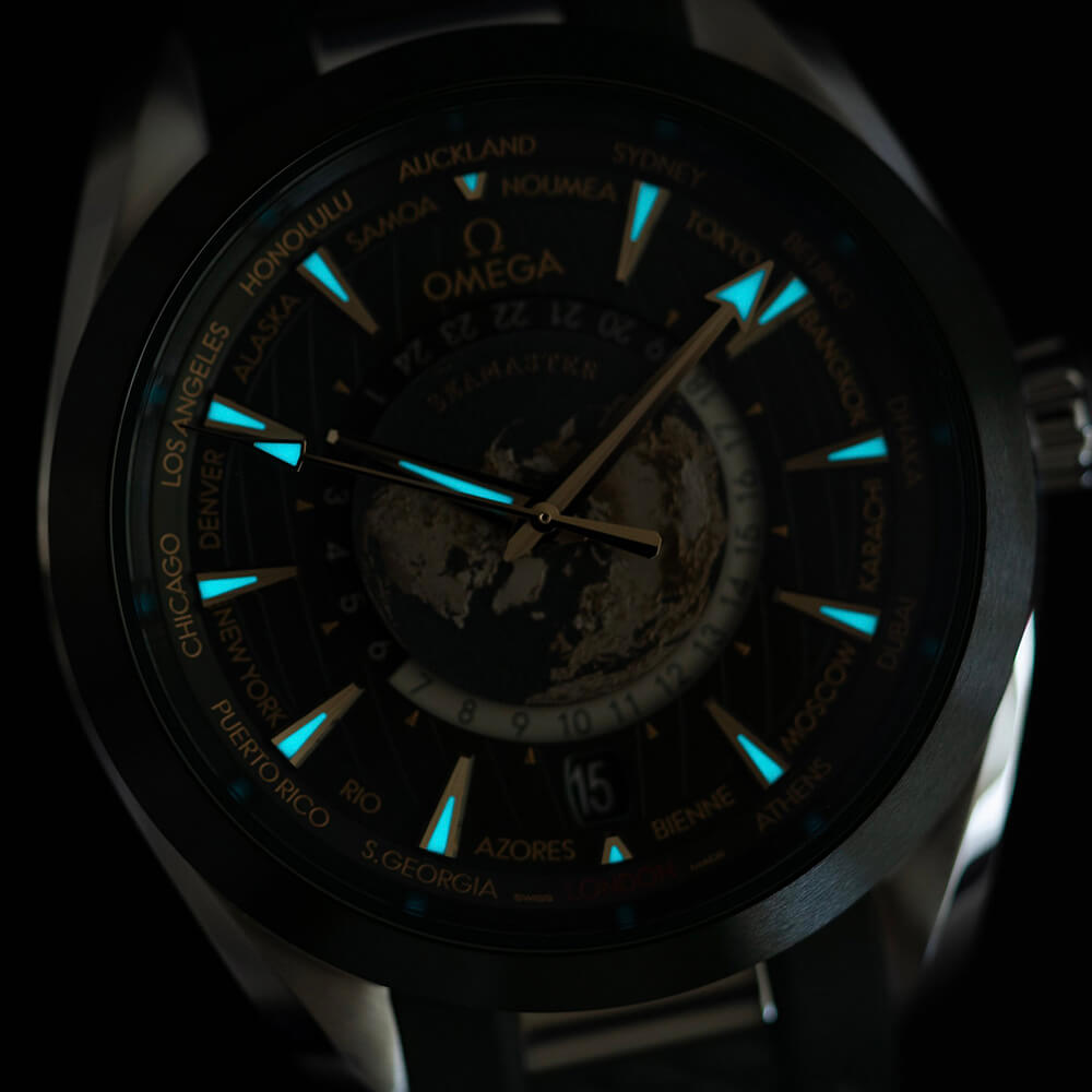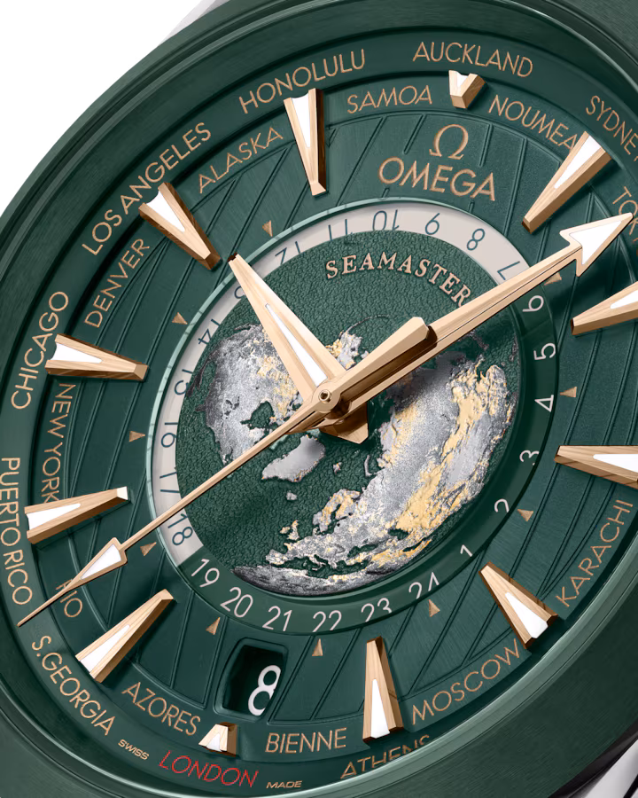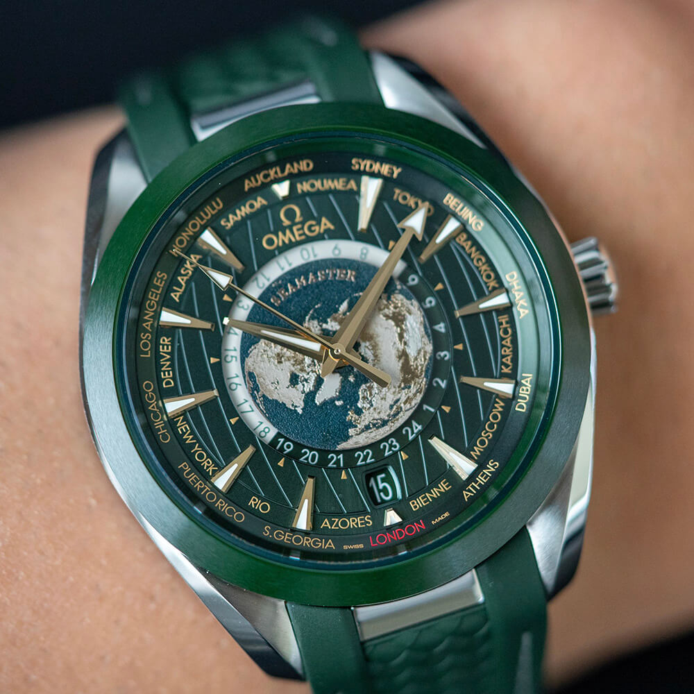 The Omega Seamaster Aqua Terra 150M Co-Axial Chronometer GMT World Timer 43mm (reference 220.32.43.22.10.001) is a striking timepiece with a rich green dial and accents of moonshine gold, giving it an elegant yet calming appearance. Released in 2023, this model stands out for its world timer function, allowing users to easily check the time in 24 cities around the globe. At the center of the dial, a titanium plate features a highly detailed 3D laser-engraved globe, adding to its allure. Powered by the METAS-certified Master Chronometer Caliber 8938, it delivers high precision, with a 60-hour power reserve and magnetic resistance up to 15,000 gauss. The watch is water-resistant up to 150 meters, making it both reliable and functional for everyday use. Its transparent case back further showcases Omega's refined craftsmanship. |