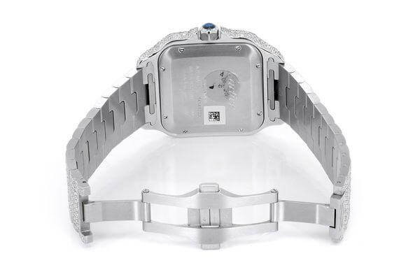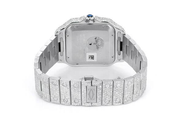 When it comes to Cartier watches, there is a popular style known as the “bust down” watch. This style showcases a luxurious and extravagant look by covering the watch with diamonds or other precious stones. CARTIER SANTOS 100 XL WATCH WITH DIAMONDS Santos watch, large model, mechanical movement with automatic winding 1847 MC. Steel case, 7-sided crown adorned with a faceted synthetic spinel, silvered opaline dial, blued steel sword-shaped hands, sapphire crystal. Steel bracelet with “SmartLink” size setting system. Second strap in calfskin, with interchangeable steel folding clasp. Both bracelets are equipped with the “QuickSwitch” interchangeability system. Case width: 39.8mm, thickness: 9.08mm. Waterproof up to 10 bars (~ 100 meters).