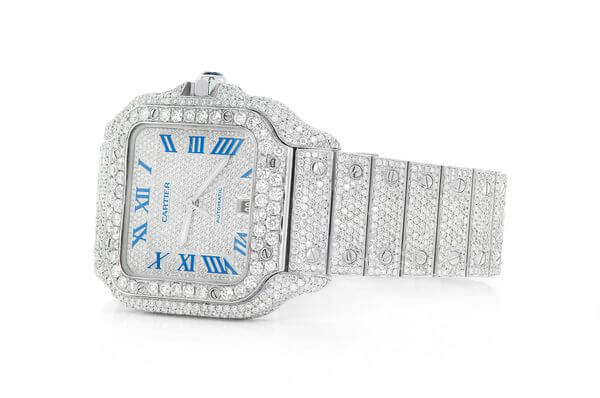 CARTIER WATCH BUST DOWN SANTOS DE 40MM STEEL FULL ICED VVS MOISSANITE BLUE ROMAN DIAL
