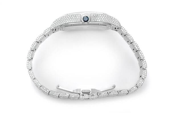 The Cartier skeleton watch stands out with its stunning iced out design. With intricate details and a transparent skeletonized dial, this timepiece exudes elegance and sophistication. CARTIER SANTOS SKELETON WATCH WITH DIAMONDS large model, Steel case, 7-sided crown adorned with a faceted synthetic spinel, silvered opaline dial, blued steel sword-shaped hands, sapphire crystal. Steel bracelet with “SmartLink” size setting system. Second strap in calfskin, with interchangeable steel folding clasp. Both bracelets are equipped with the “QuickSwitch” interchangeability system. Case width: 39.8mm, thickness: 9.08mm. Waterproof up to 10 bars (~ 100 meters).