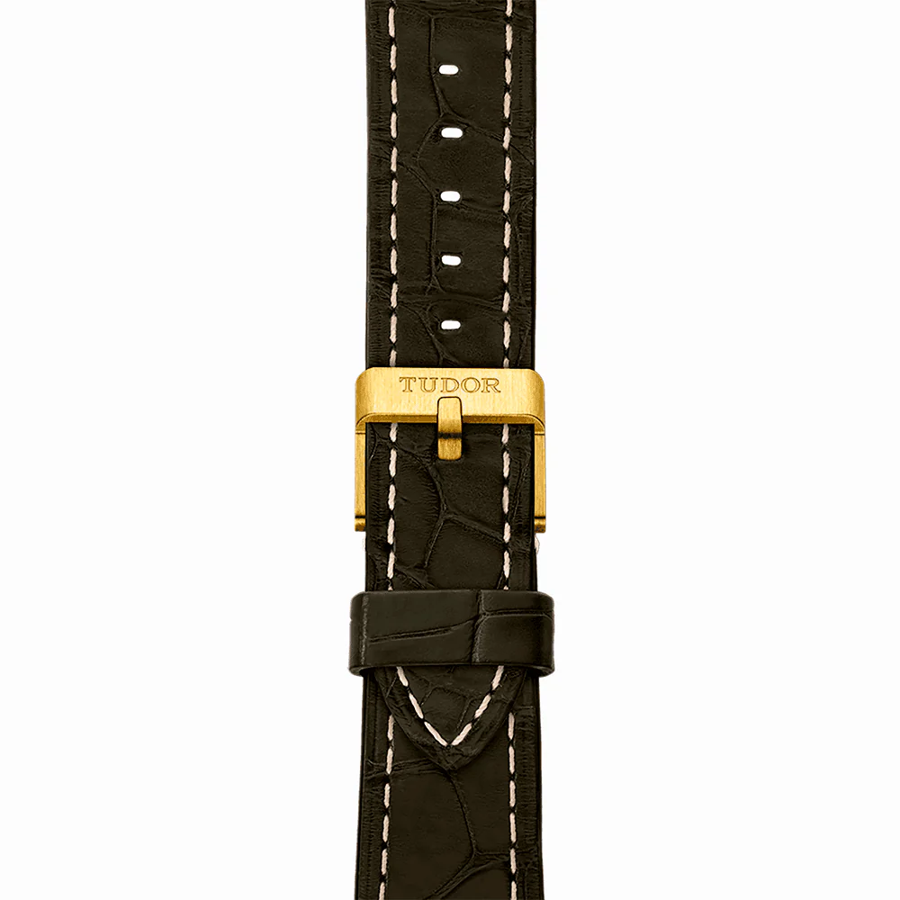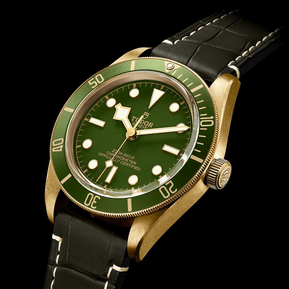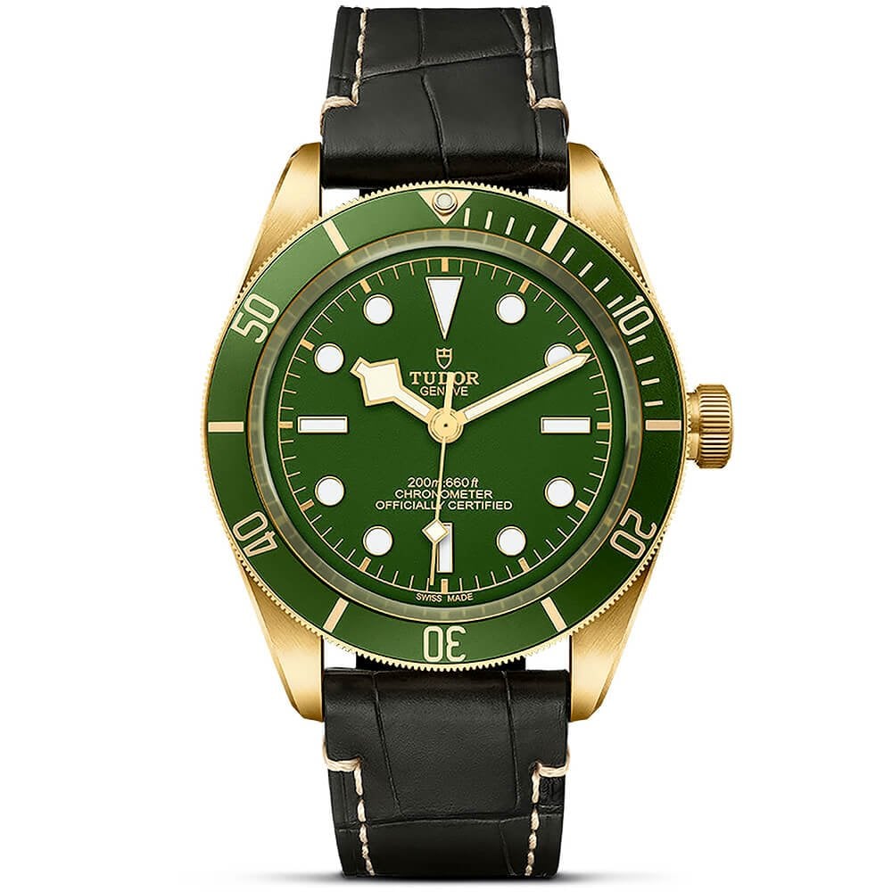 Since its introduction in 2018, the Black Bay Fifty Eight watch from Tudor has proved a popular collector’s timepiece. One distinct model started the collection which has now grown vastly into a versatile range of diver’s watches, some of which are presented in unusual colours like this stunning Tudor Black Bay Fifty Eight watch with a green-domed dial. The surface of the display is protected via a domed sapphire crystal glass front, while the hour markers and central hands have been given a generous helping of Super-LumiNova to assist with timekeeping in the dark. The 39mm case of this men’s Tudor Black Bay watch is crafted from satin-finished 18ct yellow gold and is integrated with 200-meter water resistance. A screw-down case and screw-down crown engraved with the Tudor emblem both help to assist with this impressive water resistant housing, which holds an automatic movement at its centre. The Tudor manufacture Calibre MT5400 is a self-winding engine that is built from the ground up inside Tudor’s manufacturing facilities, it provides a staggering 70-hour power reserve and puts its beautiful finishes and arrangement on show behind a sapphire crystal glass caseback. With a unidirectional rotating bezel crafted from green anodised aluminium and featuring a 60-minute dive scale - elapsed time can be measured effectively whilst underwater. The Tudor Black Bay Fifty Eight watch is completed on a dark brown alligator leather strap, attaching into place with a matching 18ct yellow gold buckle.