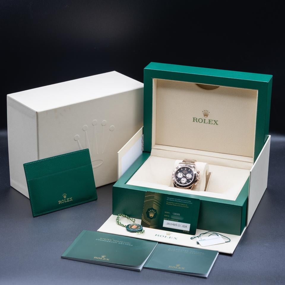 Paired with an Everose gold Oyster bracelet, complete with an Oysterlock clasp and Easylink extension, the 126505 offers both comfort and durability. Powered by the updated Caliber 4131, it delivers a robust 72-hour power reserve. This Daytona is a perfect blend of luxury and performance, making it an exceptional addition to any collector's portfolio.
