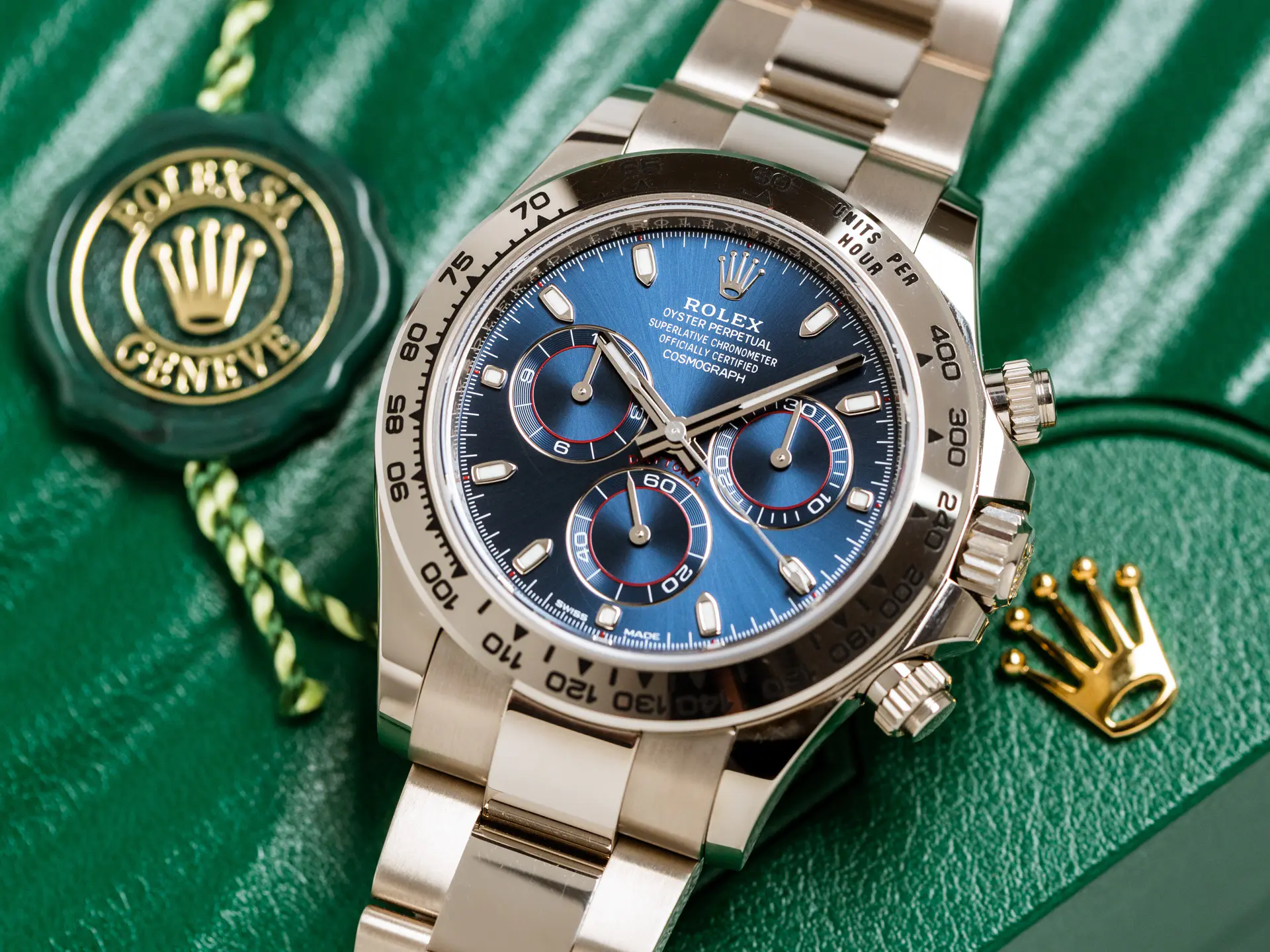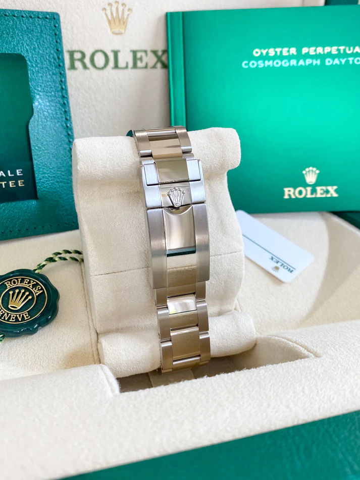 Rolex Daytona Cosmograph (116509) self-winding automatic watch, features a 40mm 18k white gold case surrounding a blue dial on an 18k white gold Oyster bracelet with folding buckle.