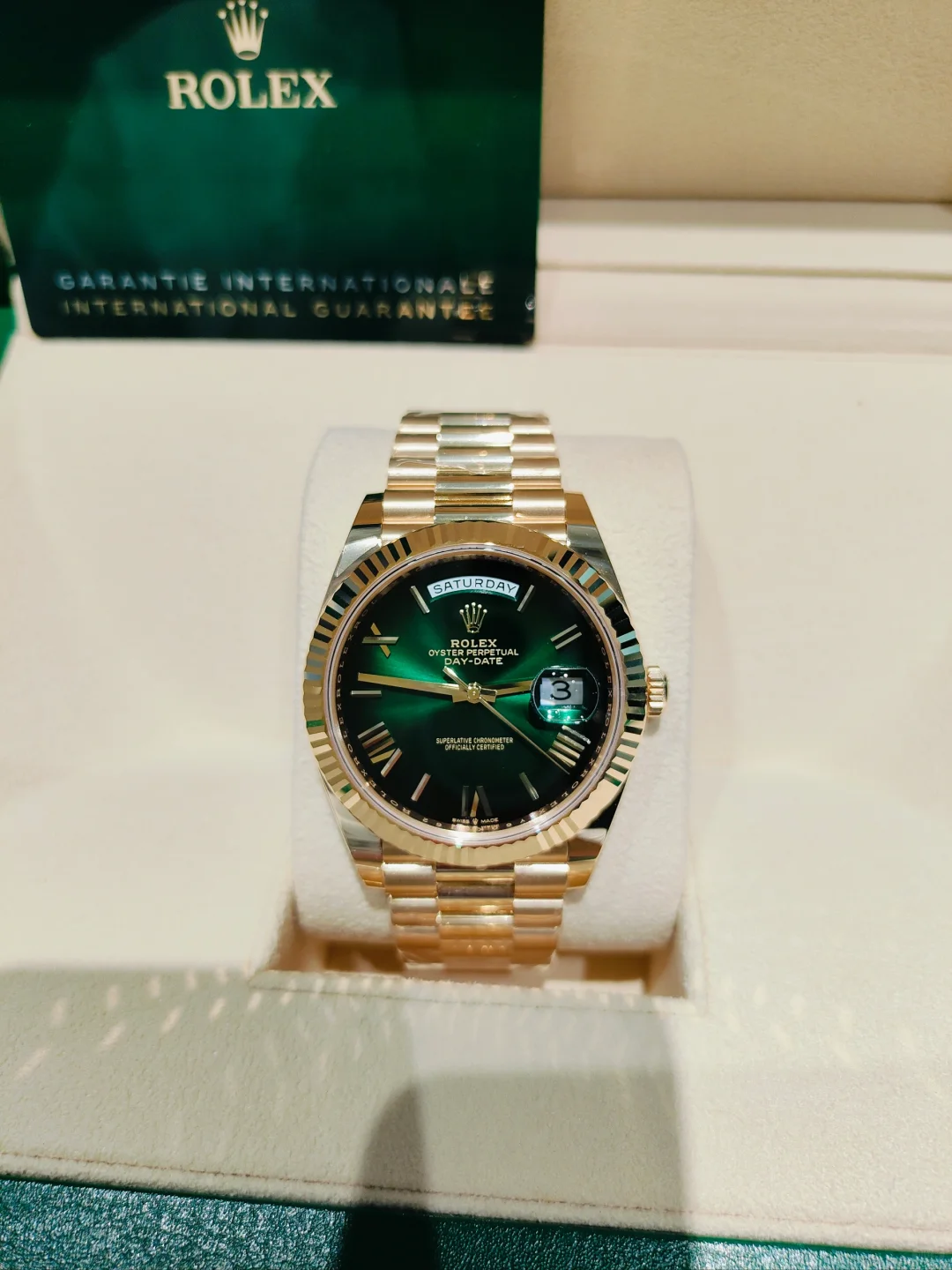 The Rolex fluted bezel is a mark of distinction. Originally, the fluting of the Oyster bezel had a functional purpose: it served to screw the bezel onto the case helping to ensure the waterproofness of the watch. It was therefore identical to the fluting on the case back, which was also screwed onto the case for waterproofness, using specific Rolex tools. Over time, the fluting became an aesthetic element, a genuine Rolex signature feature. Today the fluted bezel is a mark of distinction, in gold on this Day-Date 40.
