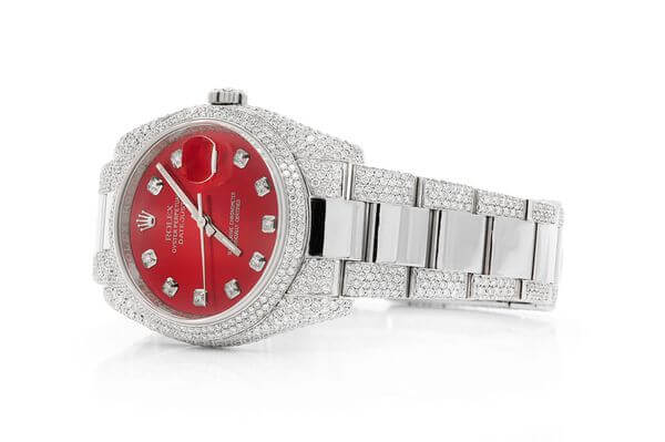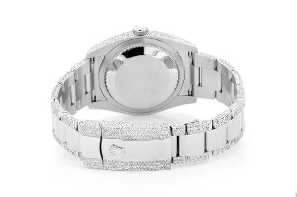 This Iced Out Rolex DateJust features a 36mm case size, is constructed of silver, and boasts 14.00ctw of Moissanite diamonds. This watch has received in-depth maintenance to the exacting standards of Rolex by our skilled watchmakers. The Rolex box for this watch is included.