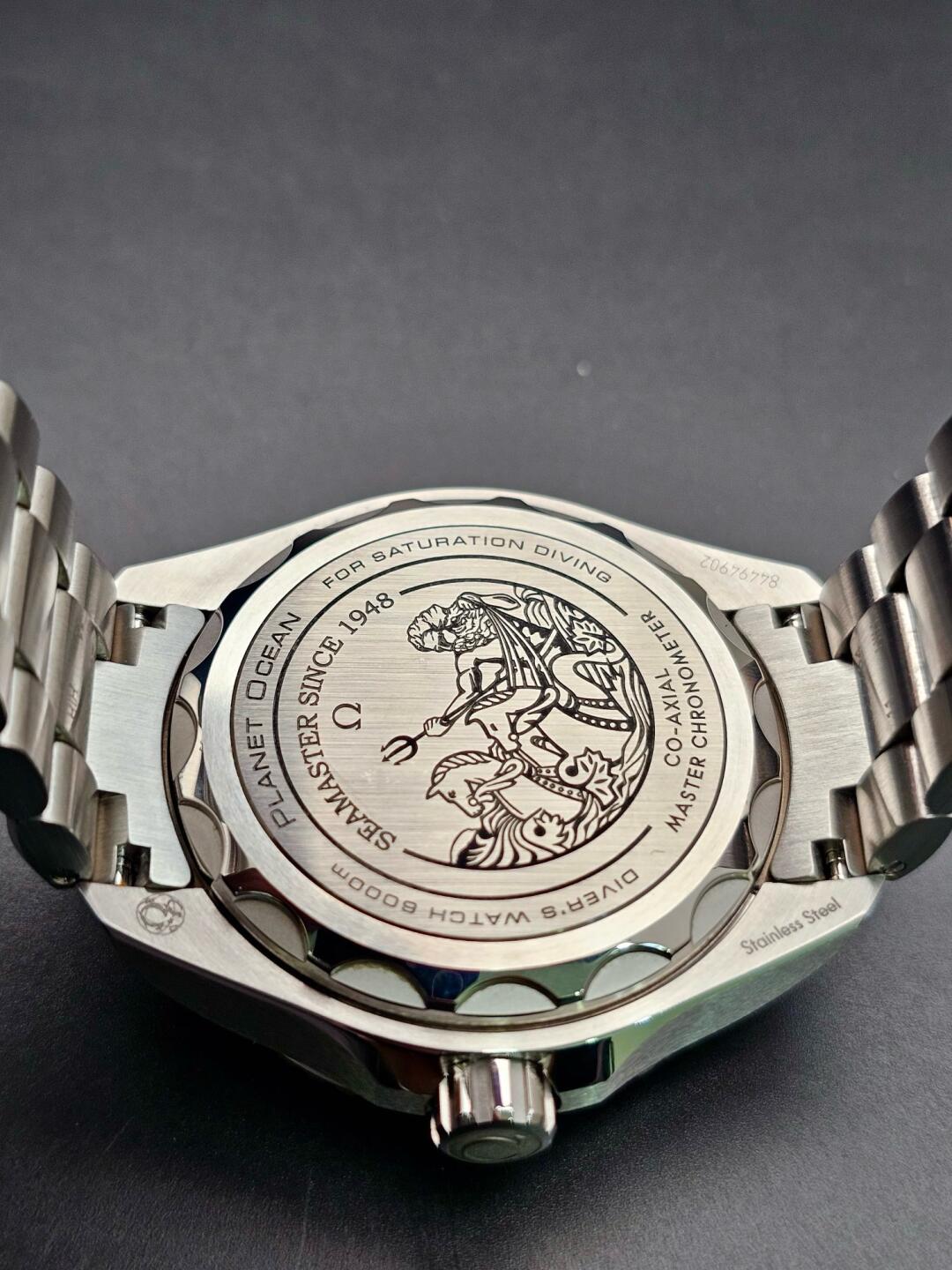 The back of the watch is decorated with a unique and commemorative seahorse logo laser-engraved, depicting the sea god Poseidon holding a trident and driving two seahorses. The two seahorses are the seahorse logo originally designed by Omega in 1956, and the seahorse logo originally designed by Omega in 1956. The current seahorse logo. The watch is equipped with the Omega Master Chronometer Caliber 8912.
