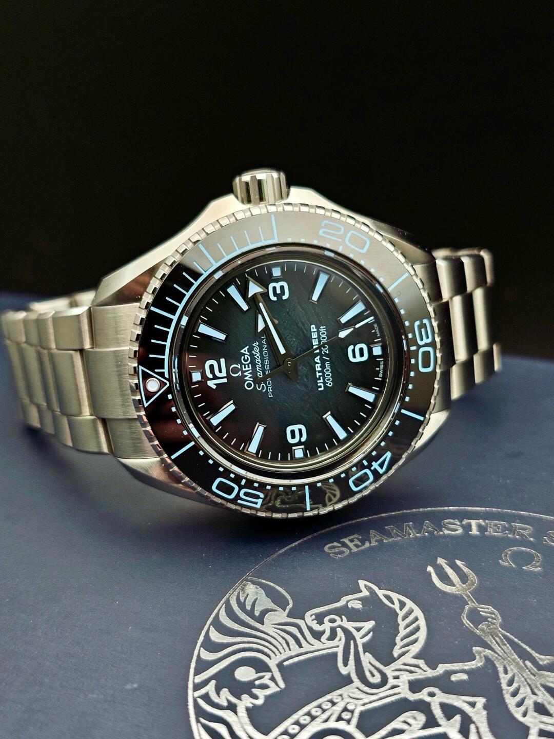The case of this watch is 45.5 mm. The case and bracelet are made of O-MEGASTEEL stainless steel alloy developed by Omega, which is strong and durable. The unusual dial design pays homage to the deep sea. The dial pattern faithfully reproduces the scene at the bottom of the "Challenger" abyss of the Mariana Trench. This pattern was mapped by the "Five Ocean Deep Expedition" team using nearly one million sonar points. The paint treatment on the dial is like sea water flowing across the dial, presenting a unique and spectacular scene at the bottom of the ocean. The dial design also hides a mystery. When ultraviolet light shines on the dial, the words "OMEGA WAS HERE" pop up in front of you, indicating the 10,935-meter world record for deep diving created by the Ultra Deep prototype watch. In addition, the dial also shows the West Pond, the Middle Pond and the East Pond at the bottom of the Challenger Abyss, which is unique and interesting.