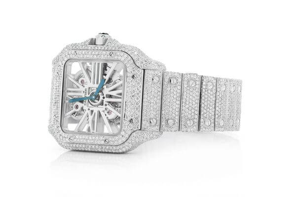 ICED OUT CARTIER SANTOS SKELETON WATCH WITH DIAMONDS large model, Steel case, 7-sided crown adorned with a faceted synthetic spinel, silvered opaline dial, blued steel sword-shaped hands, sapphire crystal. Steel bracelet with “SmartLink” size setting system. Second strap in calfskin, with interchangeable steel folding clasp. Both bracelets are equipped with the “QuickSwitch” interchangeability system. Case width: 39.8mm, thickness: 9.08mm. Waterproof up to 10 bars (~ 100 meters).