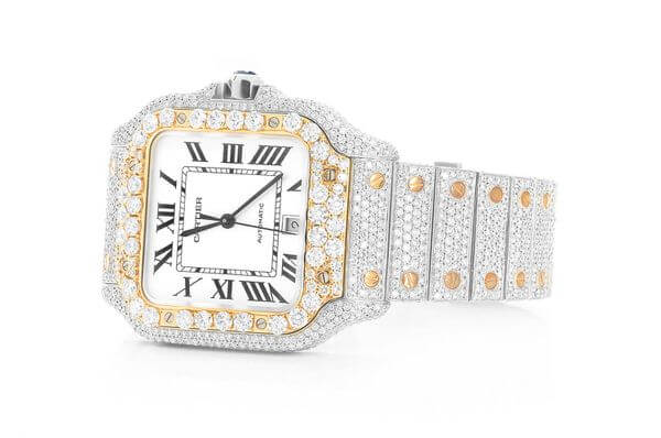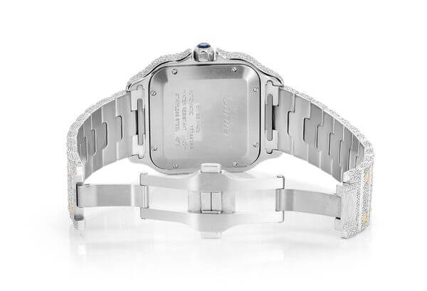 Cartier watches in the “bust down” style have become increasingly popular in recent years. CARTIER SANTOS 100 XL WATCH WITH DIAMONDS Santos watch, large model, mechanical movement with automatic winding 1847 MC. Steel case, 7-sided crown adorned with a faceted synthetic spinel, silvered opaline dial, blued steel sword-shaped hands, sapphire crystal. Steel bracelet with “SmartLink” size setting system. Second strap in calfskin, with interchangeable steel folding clasp. Both bracelets are equipped with the “QuickSwitch” interchangeability system. Case width: 39.8mm, thickness: 9.08mm. Waterproof up to 10 bars (~ 100 meters).