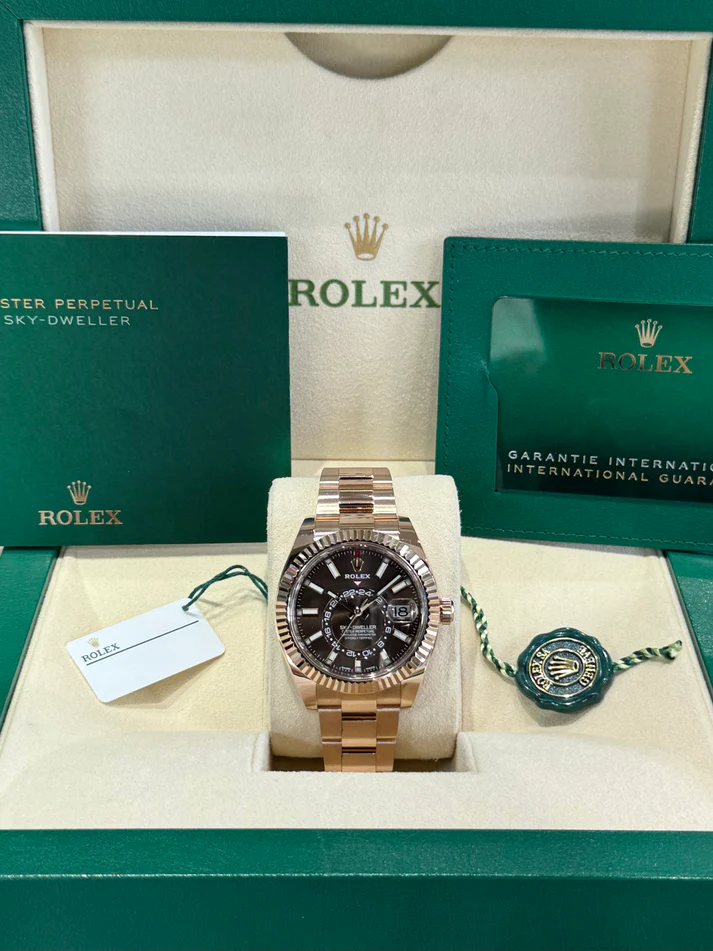 Unworn Rolex Sky-Dweller 330935-0006, 42 mm. The watch has Chocolate Dial. The Case is 18 ct Everose gold w/ 9001 Movement, 72 hours power reserve. The Bracelet 18 ct Everose gold with Folding Oysterclasp with Easylink 5 mm comfort extension link. The Water-resistant is up to 100 m. The Watch comes complete with Rolex Papers & Box. Covered with Rolex 5-Year Warranty.