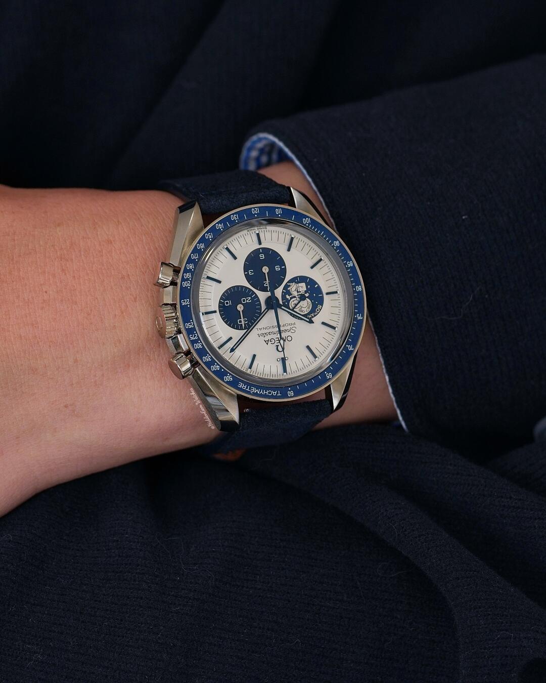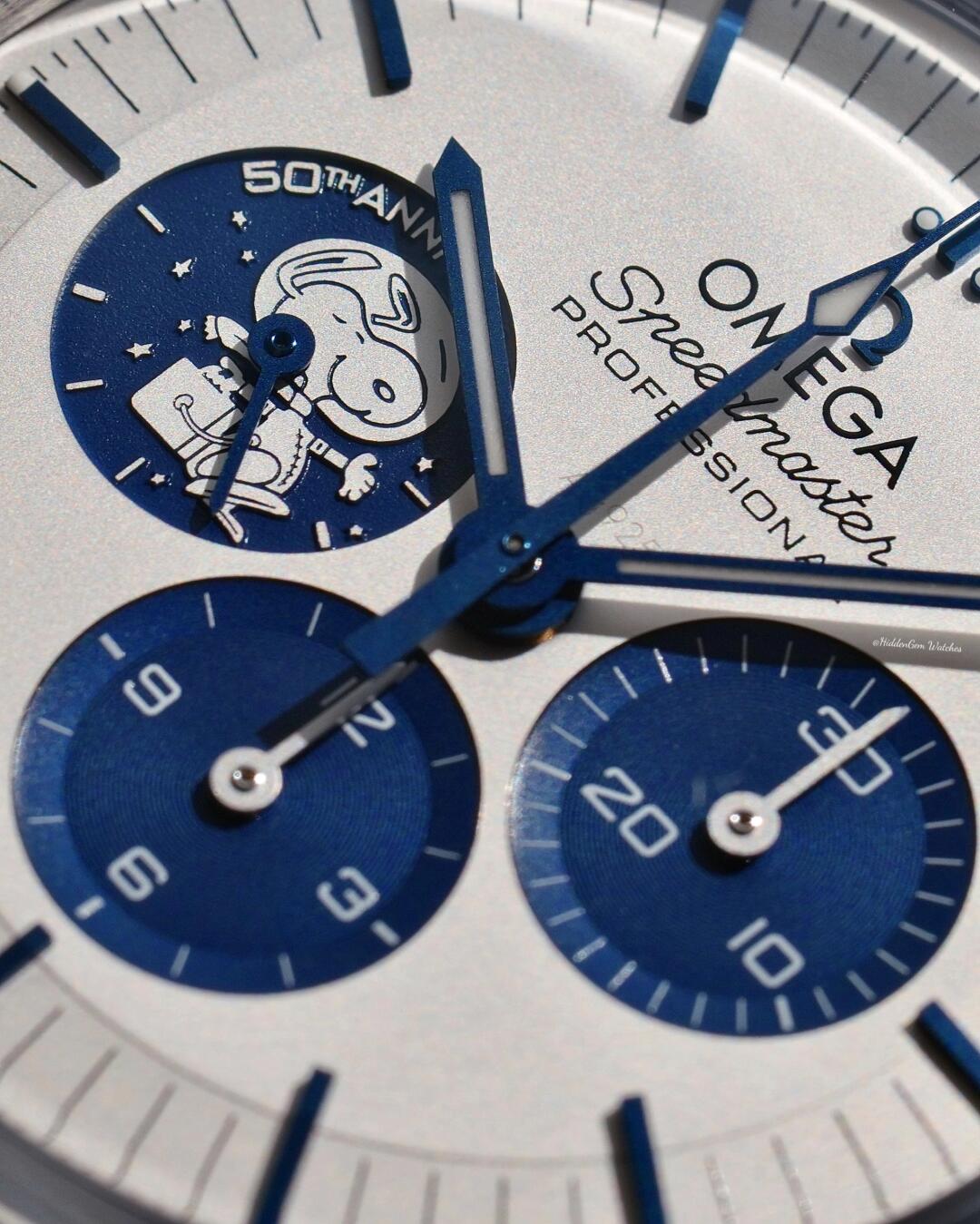 The appearance of the new Speedmaster Snoopy commemorative watch continues the style of the previous generation, including the 42mm stainless steel case and the lower three-eye chronograph dial, etc., but the latest third-generation interpretation of the Snoopy medal pattern is still different from the predecessor; the pattern of the first generation is colorful, while the third generation has a white Snoopy medal pattern engraved on the blue small dial, and the words "50th Anniversary" are added above the pattern. In addition, if you look closely at the 12 o'clock position on the dial near the pointer, Omega has written the words " Ag925 " in an intaglio manner, indicating that the dial is made of silver, which slightly echoes the story of NASA's Silver Snoopy Award.