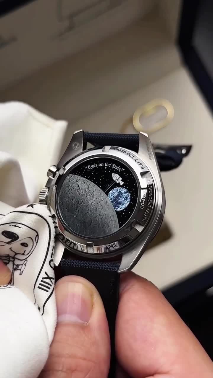 A feature of the first two generations of Speedmaster Snoopy watches is that the viewability of the case back is no less than that of the dial, but they are all static images. With the third generation, Omega has a new idea - and it is a dynamic expression. When you turn to the back of the third generation watch, you will be surprised to find the moon in the foreground and the earth in the background, plus the starry universe around it, and there is also Snoopy in a flight suit sitting on a space shuttle. The moon is made using a unique microstructure metallization technology and is decorated on the back of the sapphire crystal case. In addition, the earth pattern is not just a decoration. In fact, it moves with the small second hand on the dial, rotating once a minute. Also moving is Snoopy sitting on the space shuttle. Once the wearer starts the chronograph function, the Snoopy pattern will rotate counterclockwise and even disappear under the moon in the middle. It will reappear at about five o'clock, as if running along the orbit.